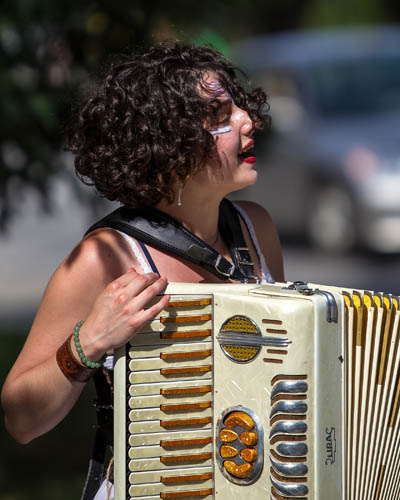Young accordian street musician, Laci Harmon, plays and sings during the 2012 July 3rd parade in Montpelier Vermont.