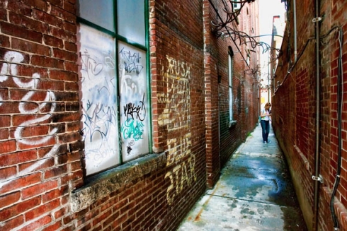 Alley between the Coffee Corner and Bear Pond Books in Montpelier Vermont.